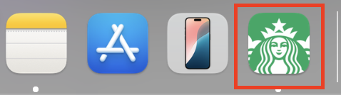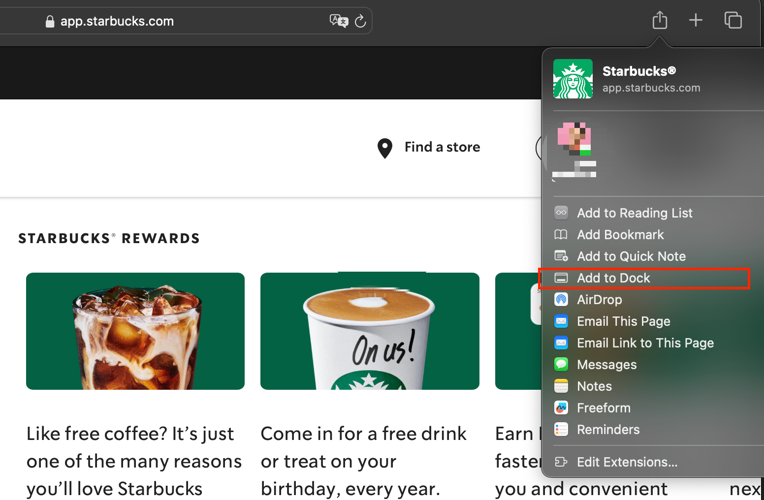 Safari에서 공유하기 버튼을 클릭하면 "Add to Dock"을 볼 수가 있다. 이를 클릭하면 Dock에 스타벅스 App이 추가가 된 것을 볼 수 있다.